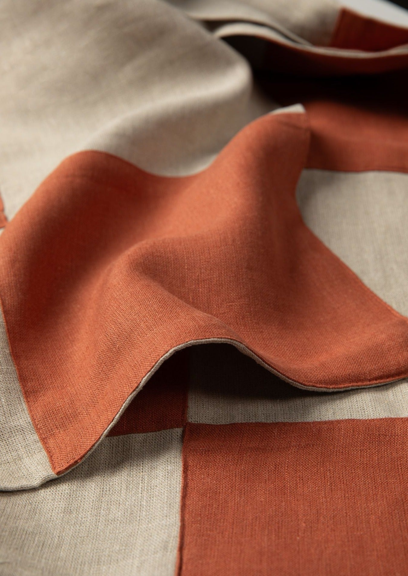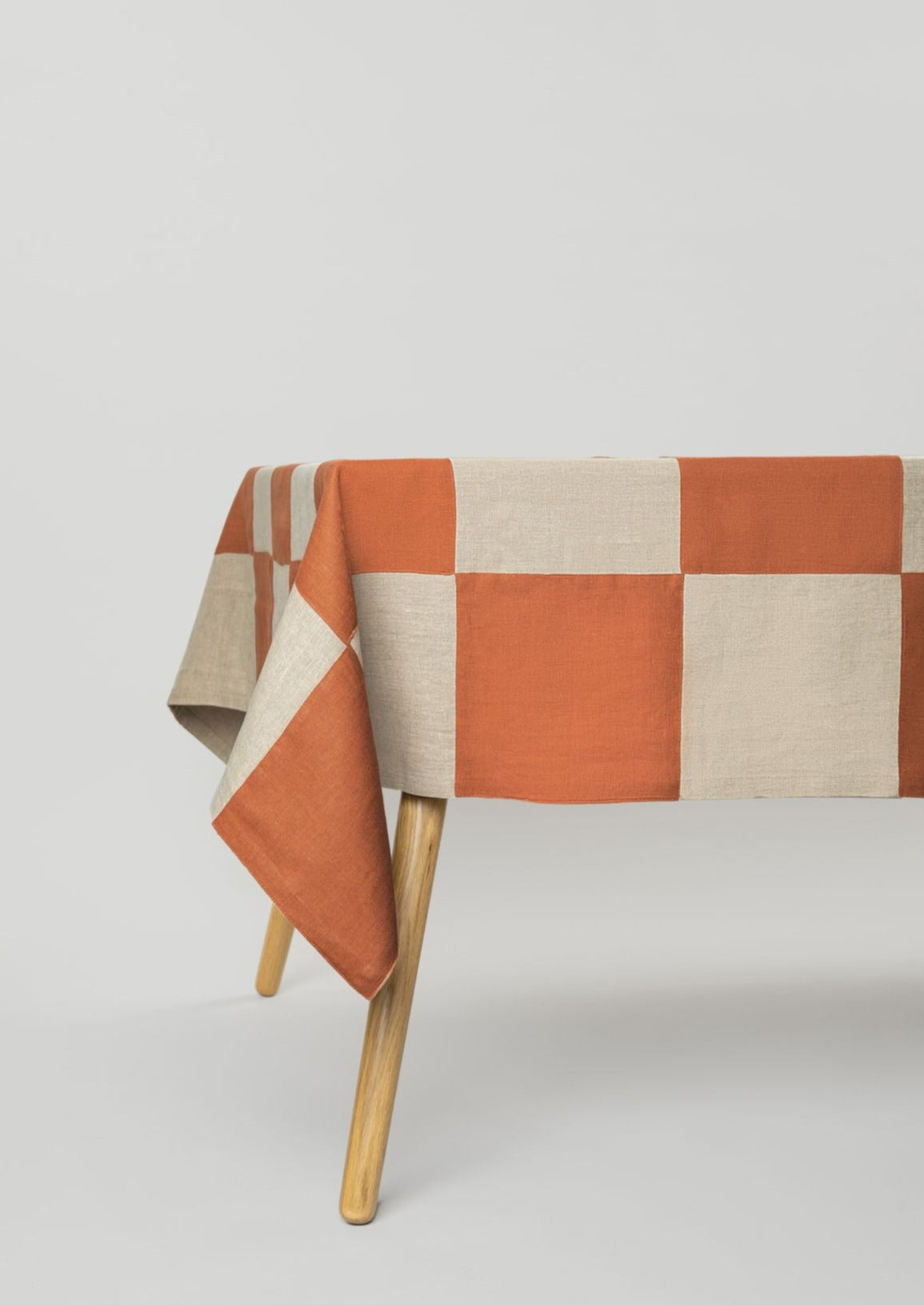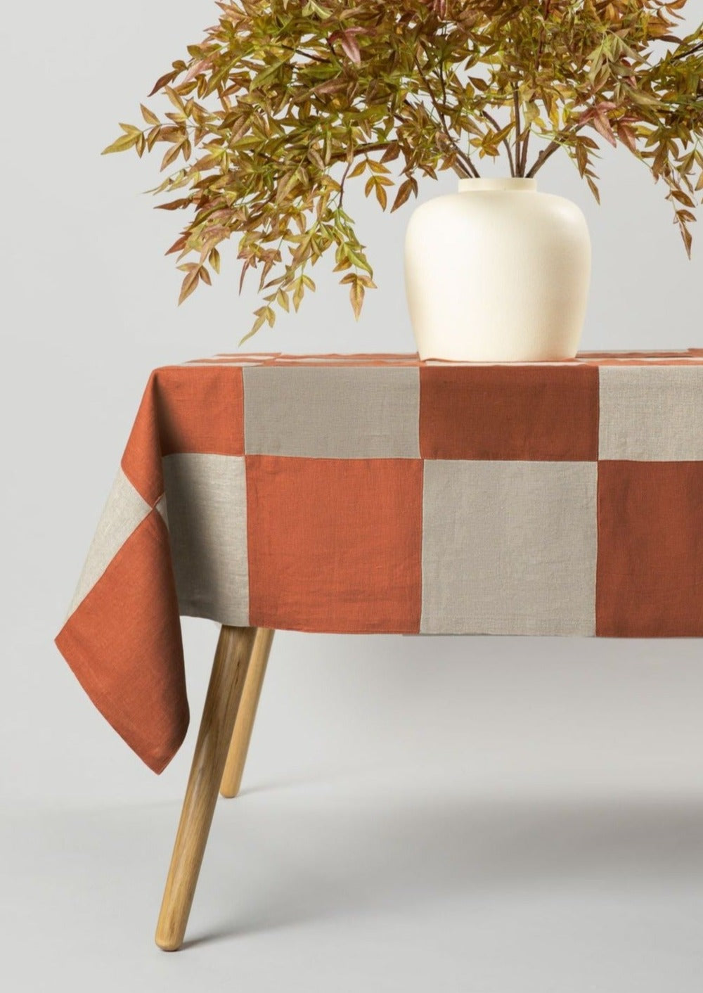 The handcrafted Alex Tablecloth from Malaika Linens is a true work of art. This beautiful taupe and terracotta linen tablecloth is made with appliqué chequers that create a checkered, patchwork pattern. This design is inspired by summers in cosmopolitan Alexandria, Egypt, where laughter and the music of Dalida fill the air. No matter the occasion, this stylish linen elevates any meal setting and brings luxury to the dining table.