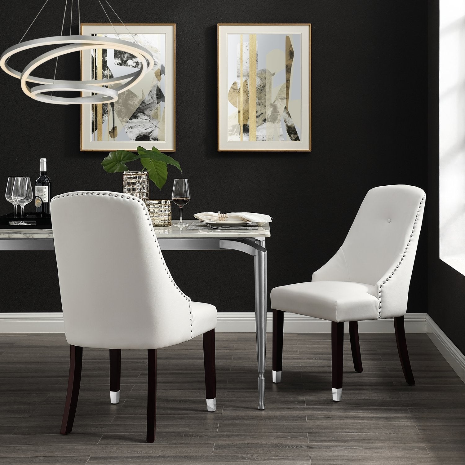 - SET OF 2 - Sold as a set of 2 matching chairs. Pair it with any dining table to add a luxurious and elegant look. Designed to dress up any dining space, this set of two chairs features velvet/leather PU upholstery in a choice of color.