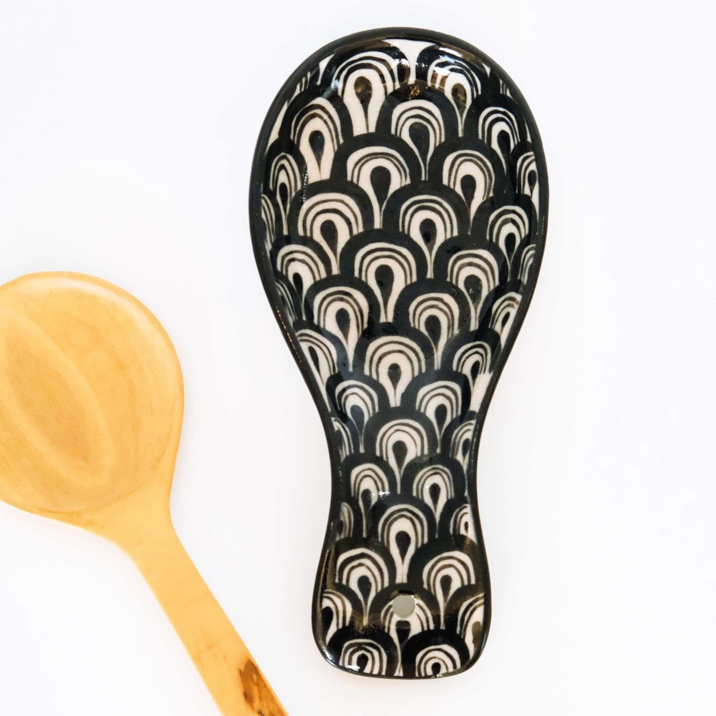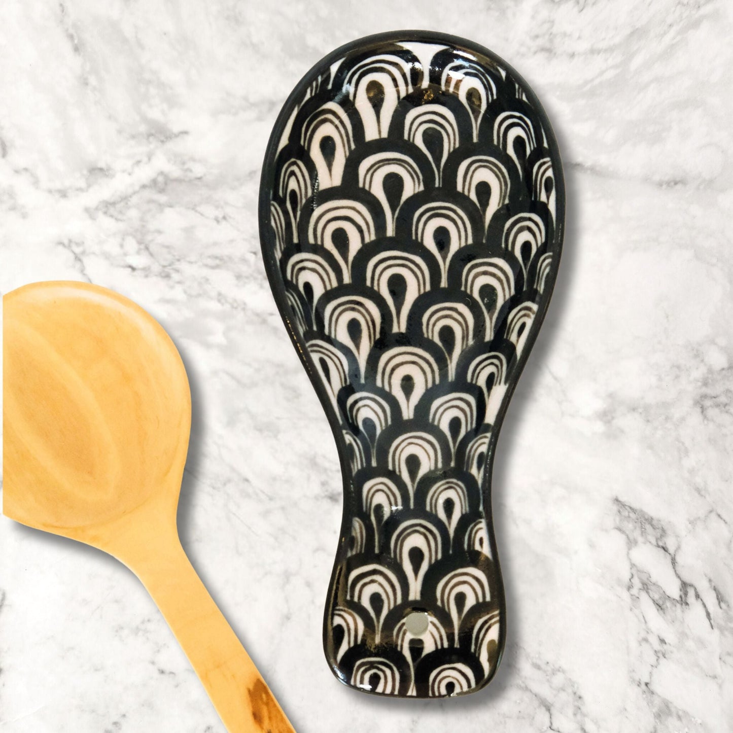 Introducing our exquisite Black Stoneware Spoon Rest, a perfect blend of beauty and functionality. This genuine Guatemalan ceramic piece is designed to enhance your kitchen decor while keeping your countertops clean. Whether placed on the stove top or counter, or elegantly hung on the wall, it adds a touch of sophistication to any space.