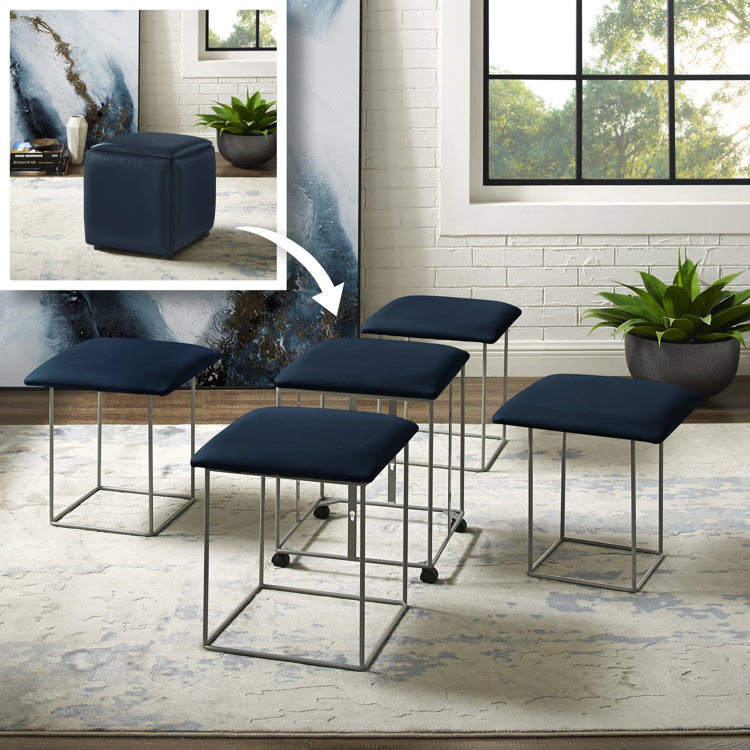 This cube 5 in 1 transforming ottoman seat is made for sharing with your guests for your next events. The padded comfortable tops are modern upholstery leather PU and enjoyable to sit on. When your guests arrive, you remove the padded cube seats off the base and place it on the strong nested metal bases, and convert into 5 seats. On top of this, it works well as a single space-saving seat tucked under a table console or seating near your sofa. You can save plenty of space with our stunning nesting ottoman/stool set that is available in multiple colors and looks great on its own in your living room, bedroom or dorm room.