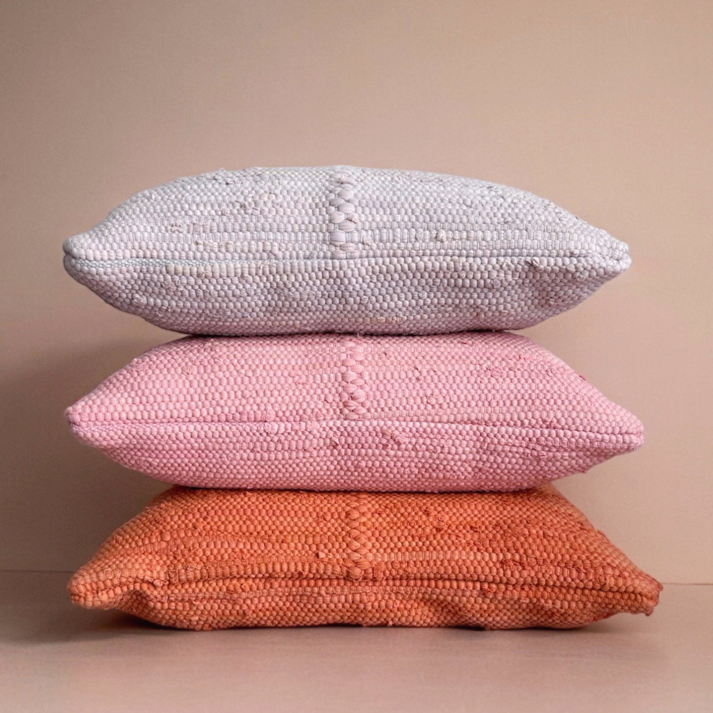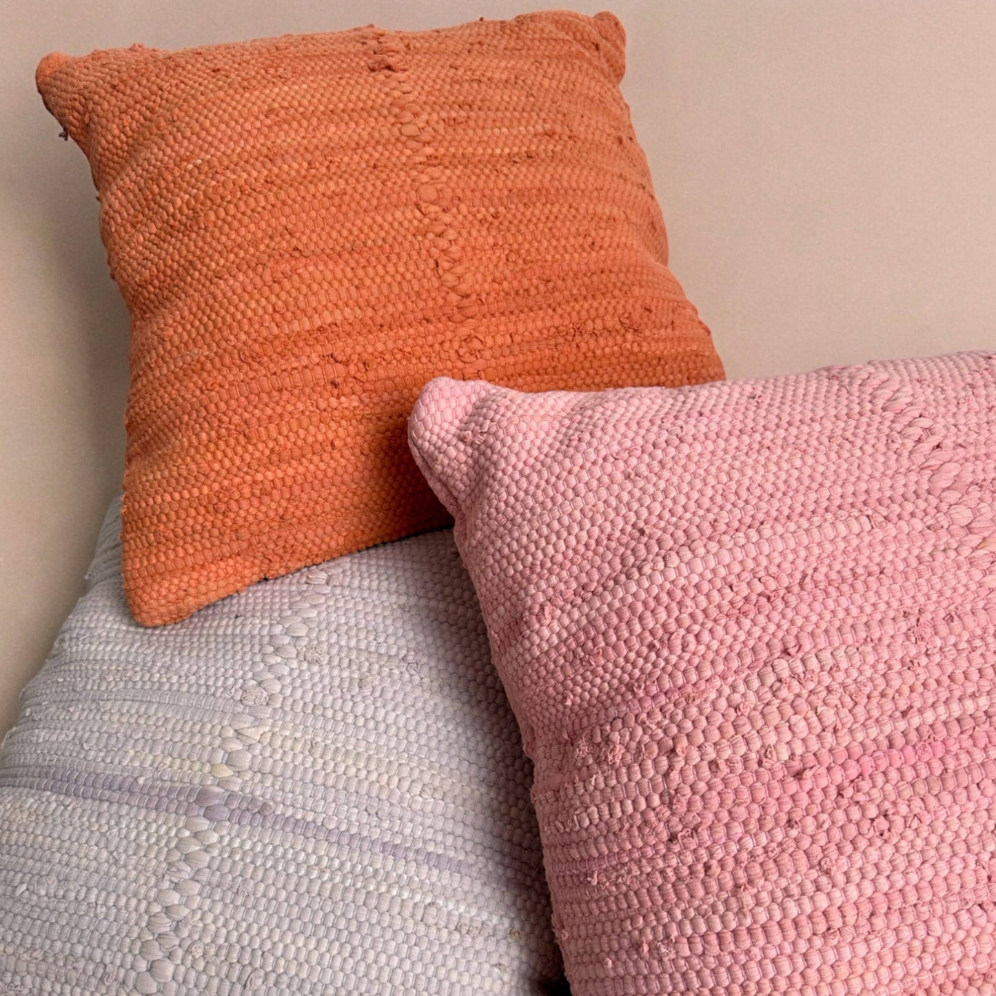 Introducing the exquisite Chindi Pillow Cover in Clay, crafted by the renowned Pillowpia. This handcrafted chindi rag rug pillow embodies the timeless tradition of rag rug making, transforming leftover fabric scraps into a masterpiece. The braided edge is prominently displayed, showcasing the rich texture and artisanal quality that make these pillows truly unique.
