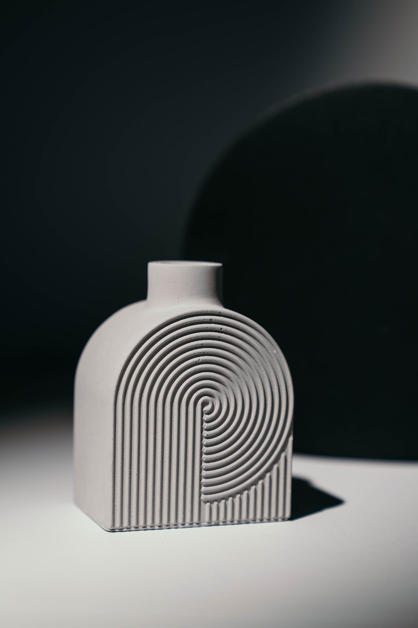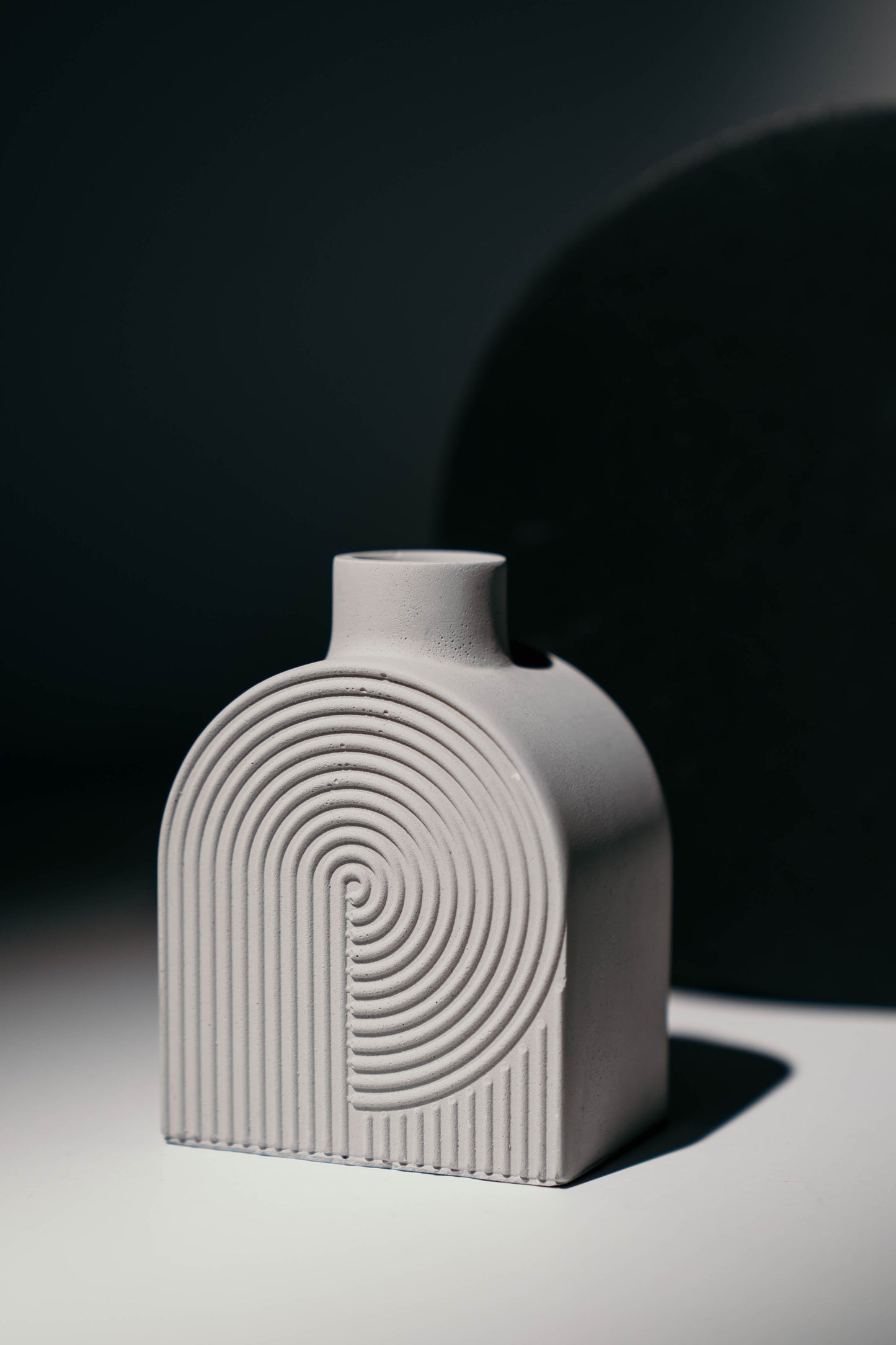 Discover the elegance of a unique postmodernform creation with this compact concrete vase. Its distinctive groove pattern adds a timeless touch to any shelf or tablescape, making it a versatile piece for your home decor. Whether used as a flower bud vase, a bookend, or a standalone objet d'art, this vase is sure to impress.