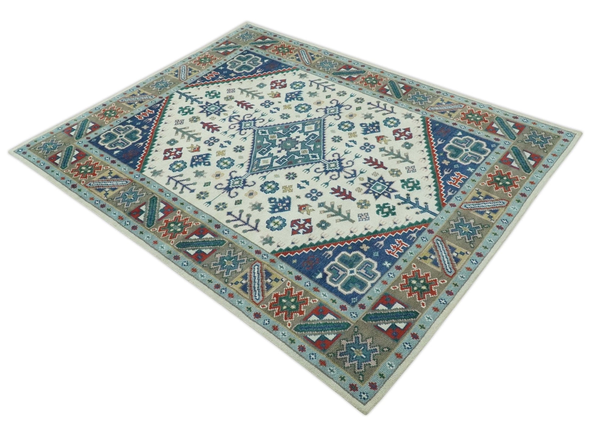 Custom Made Colorful Ivory, Blue, Brown and Teal Hand Knotted Traditional Heriz size wool Area Rug