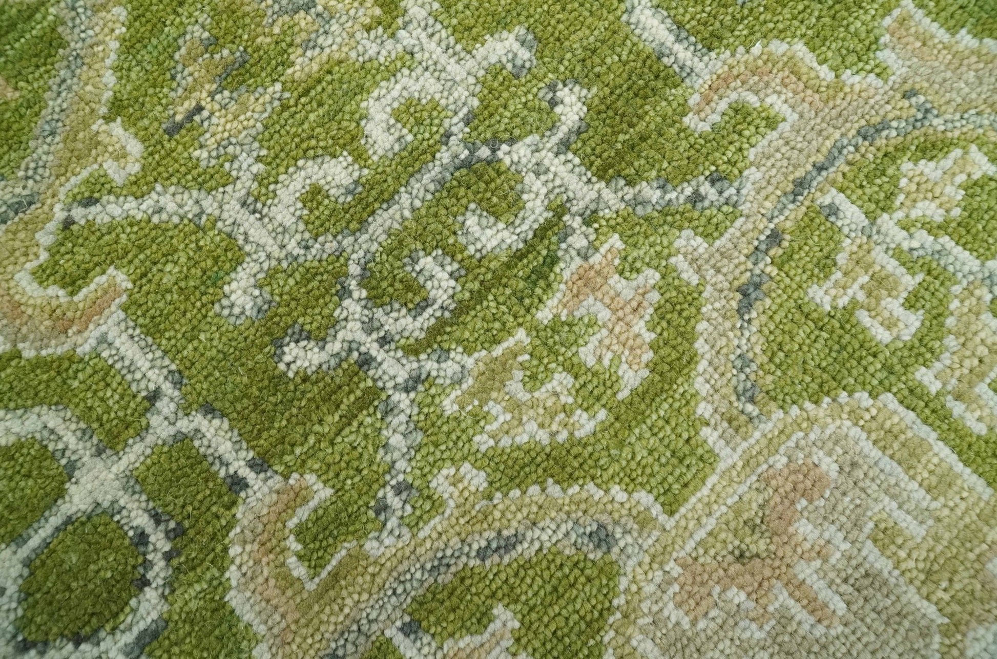 This custom-made rug features a traditional Dragon Oushak design hand-knotted from high-quality wool in green and ivory tones. With its unique design and expert construction, this rug adds both elegance and durability to any space.