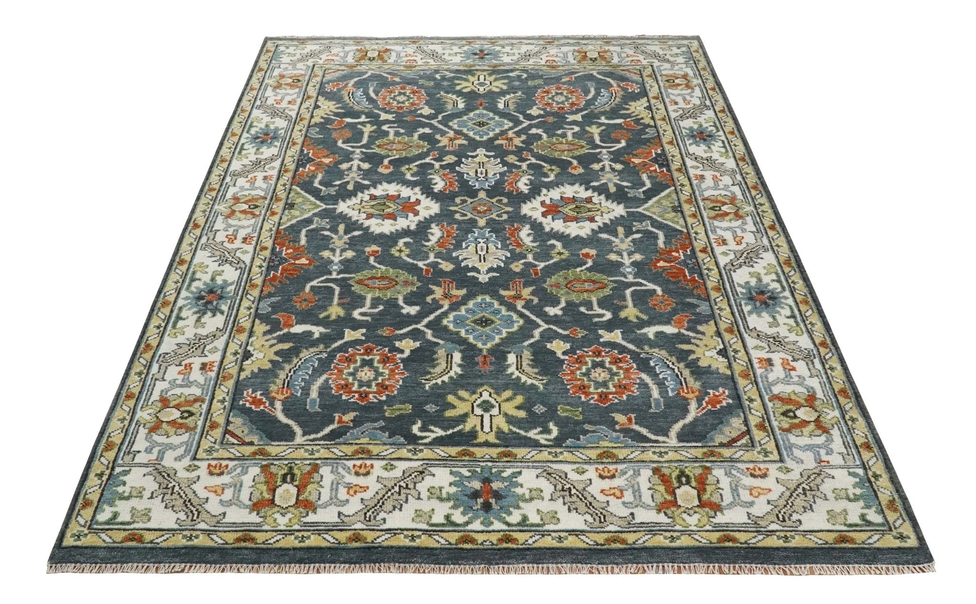 Custom Made Hand Knotted Teal, Blue and Ivory Traditional Oushak Wool Area Rug