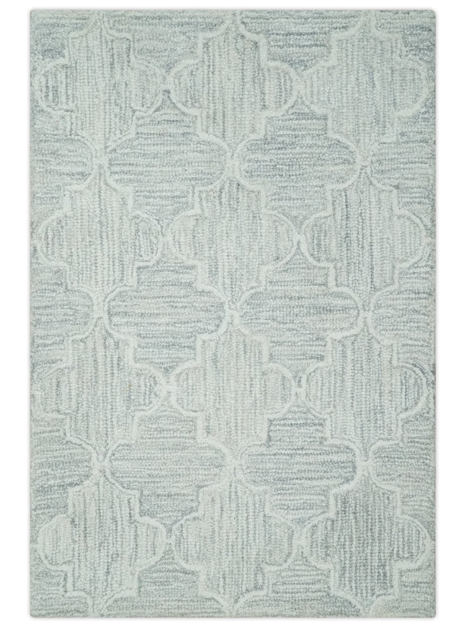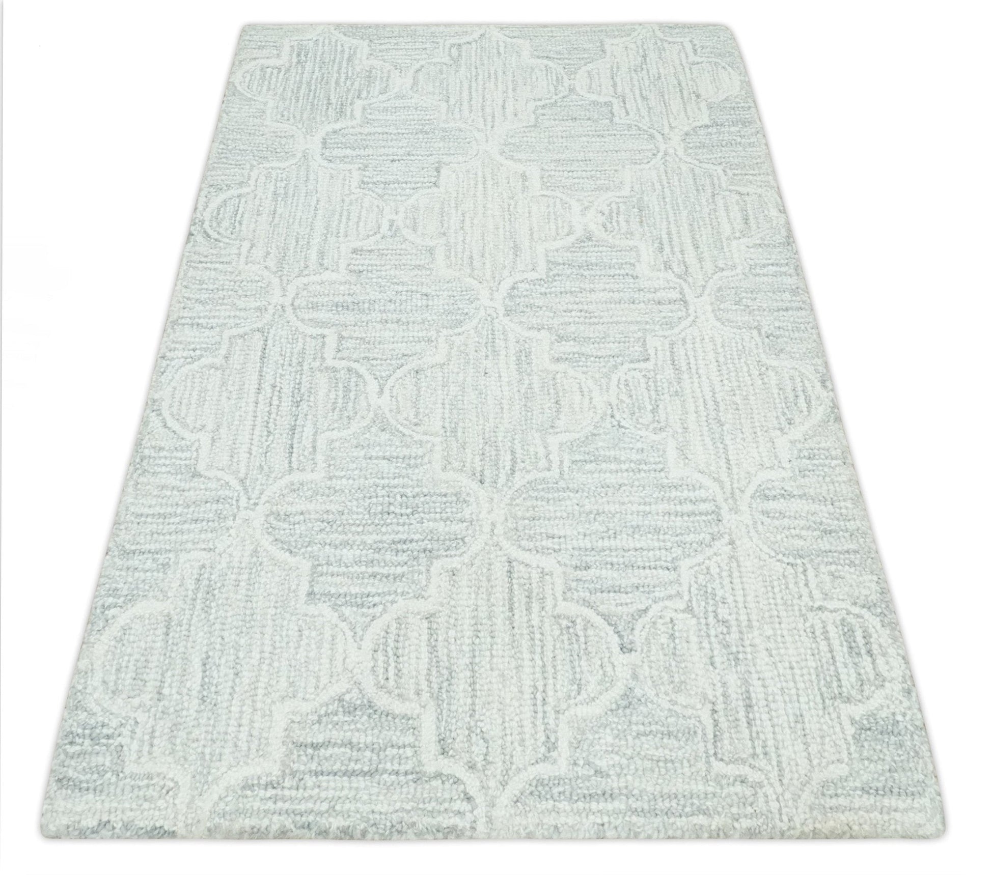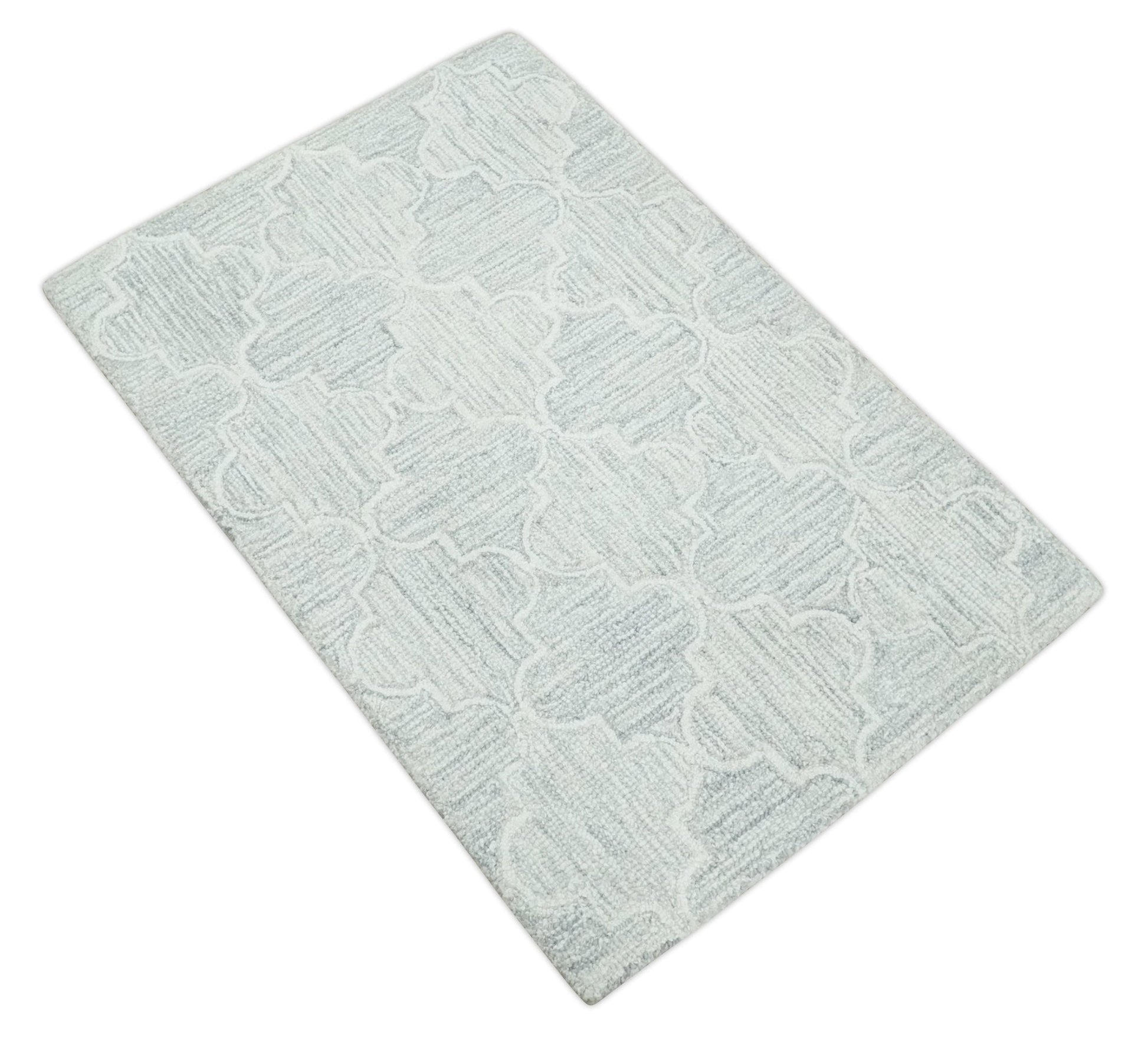 Custom Made Ivory and Silver Modern Geometric Hand Tufted Natural Wool Area Rug