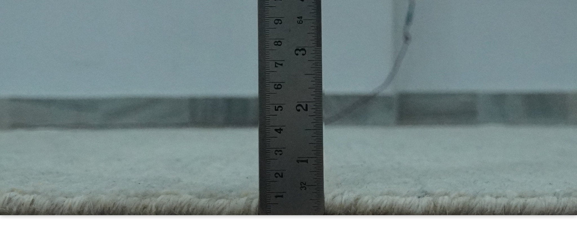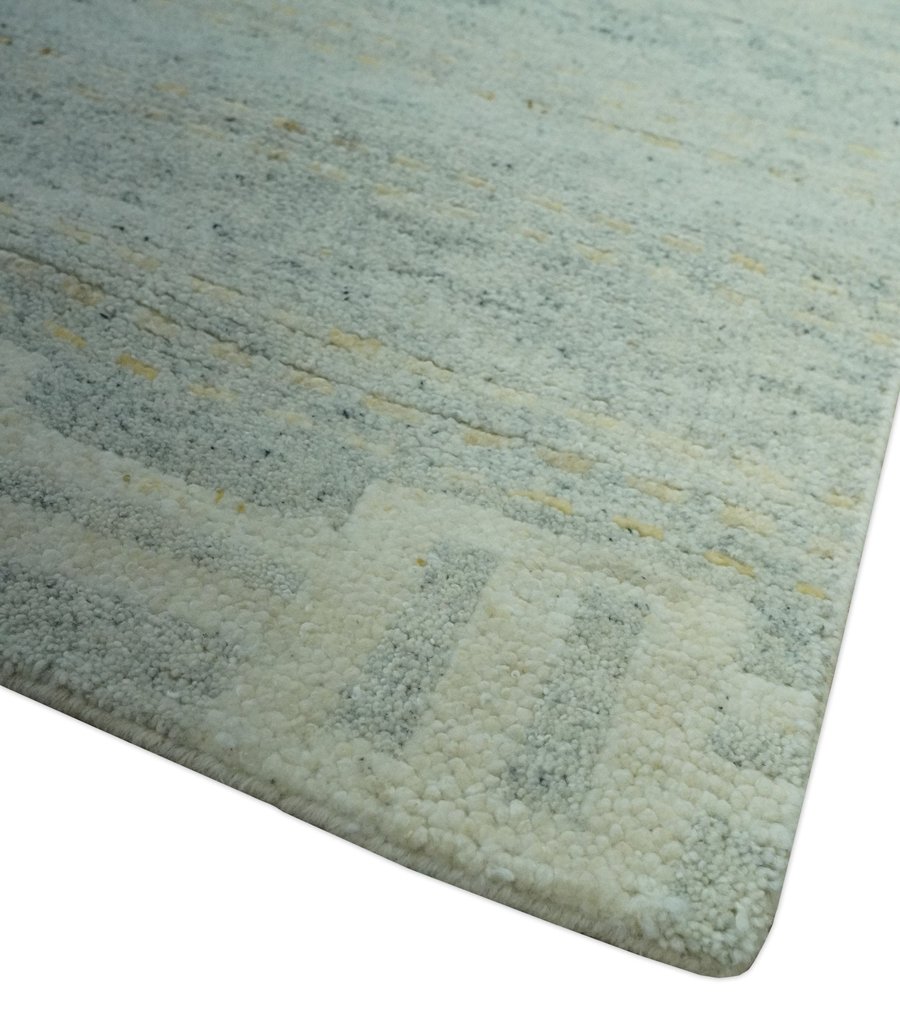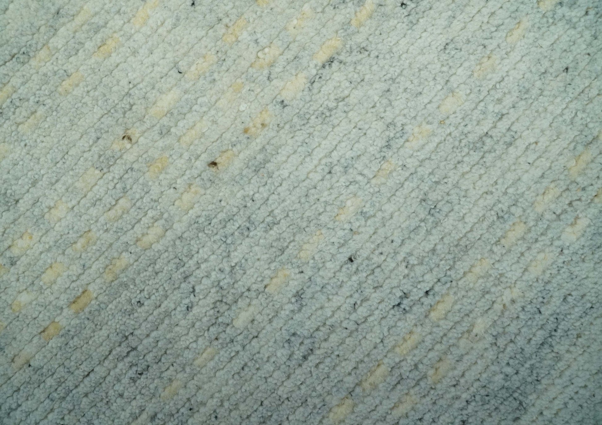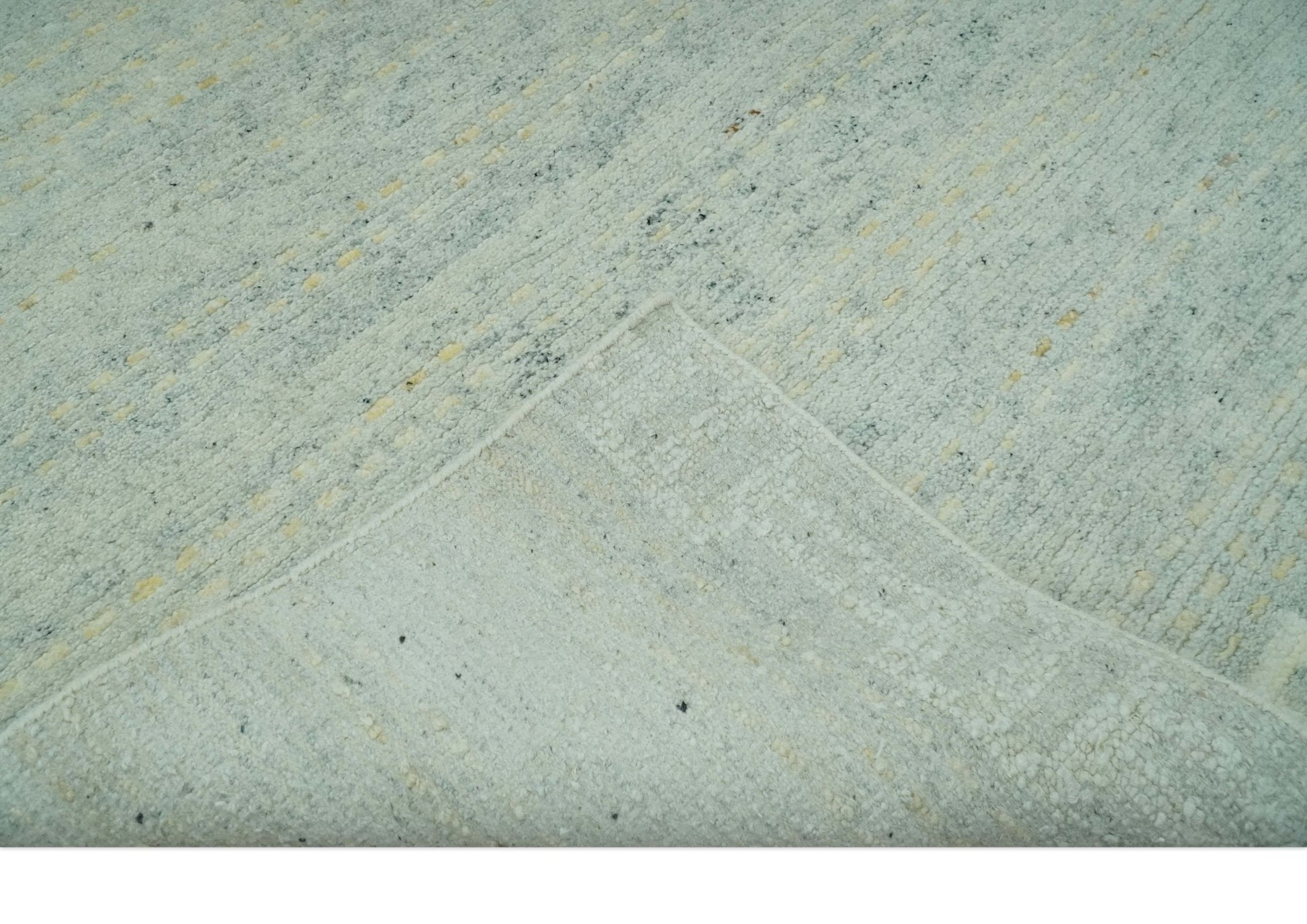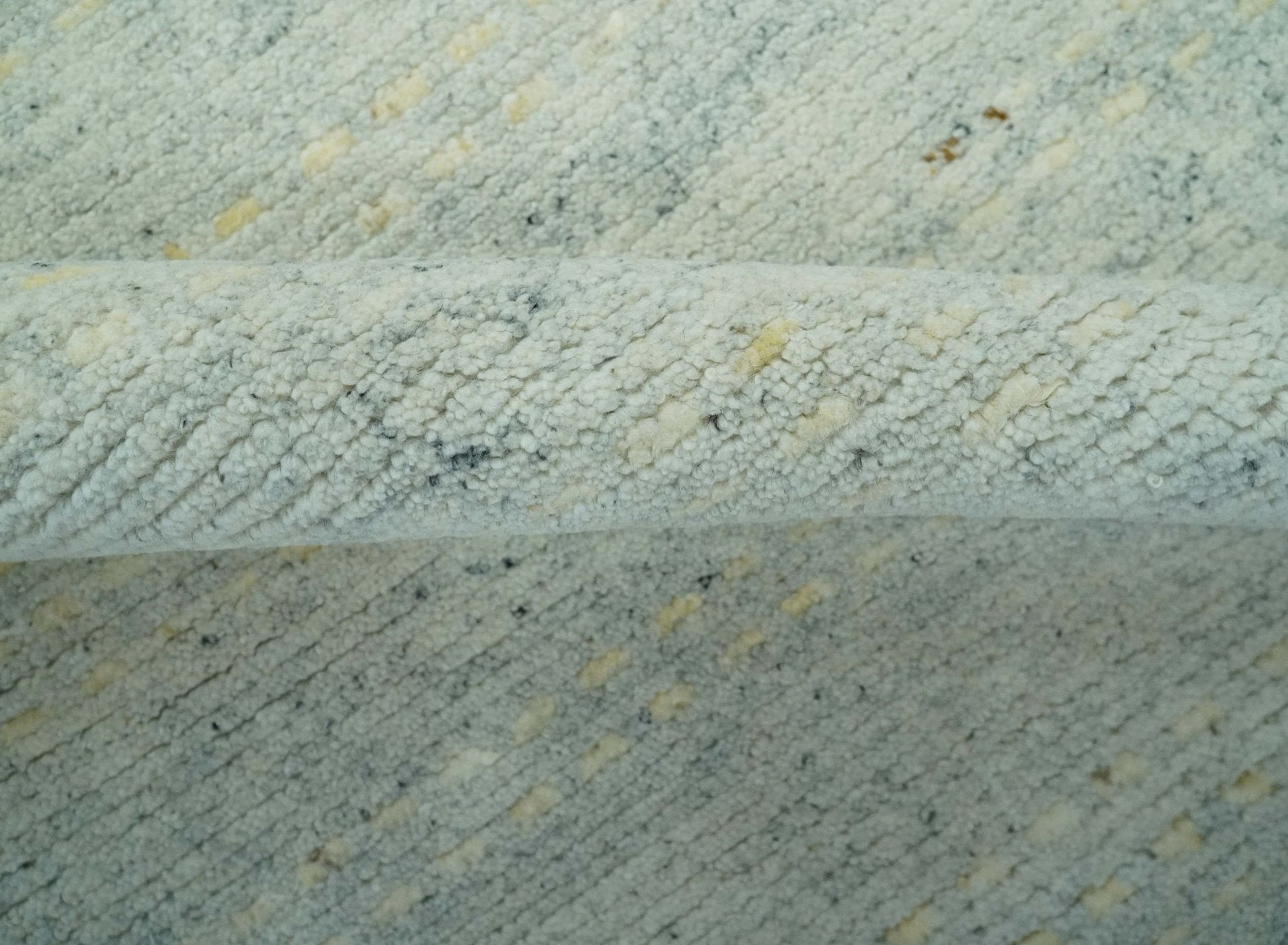Expertly handcrafted with a custom design, this wool area rug features a modern color scheme of silver, gray, and beige stripes. The hand-knotted technique ensures durability and a luxurious feel underfoot. Elevate any space with this unique and high-quality addition to your home.