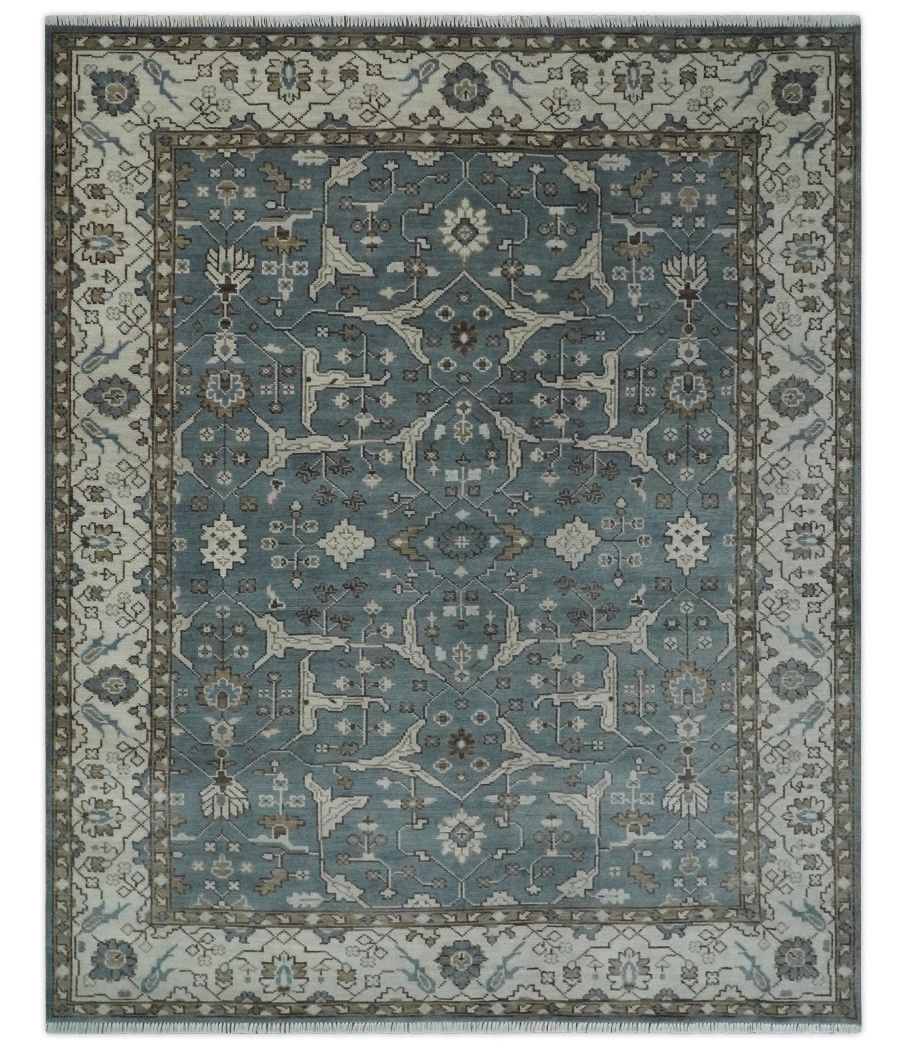 Custom Made Traditional Hand Knotted Blue, Ivory and Brown Oriental Oushak wool Area Rug
