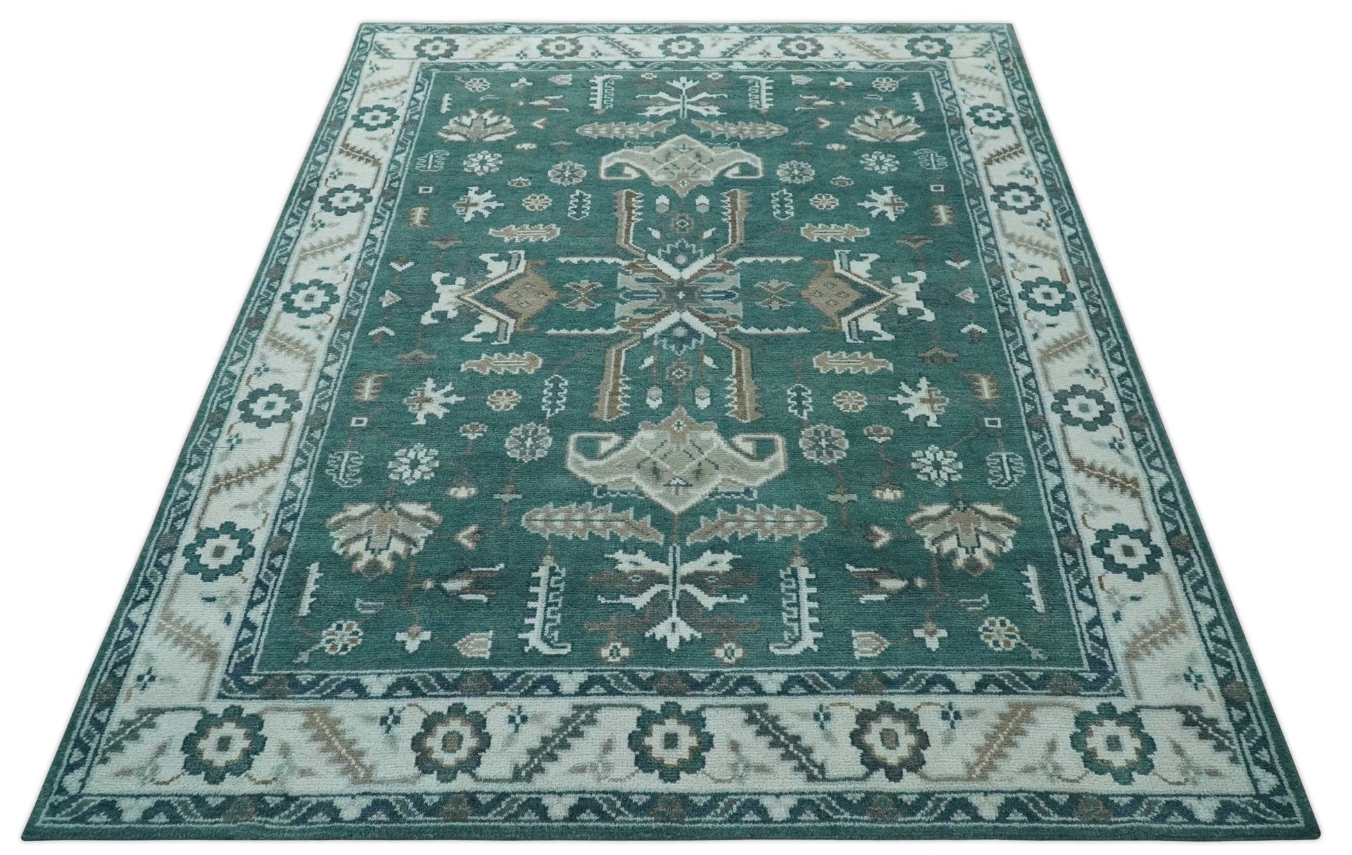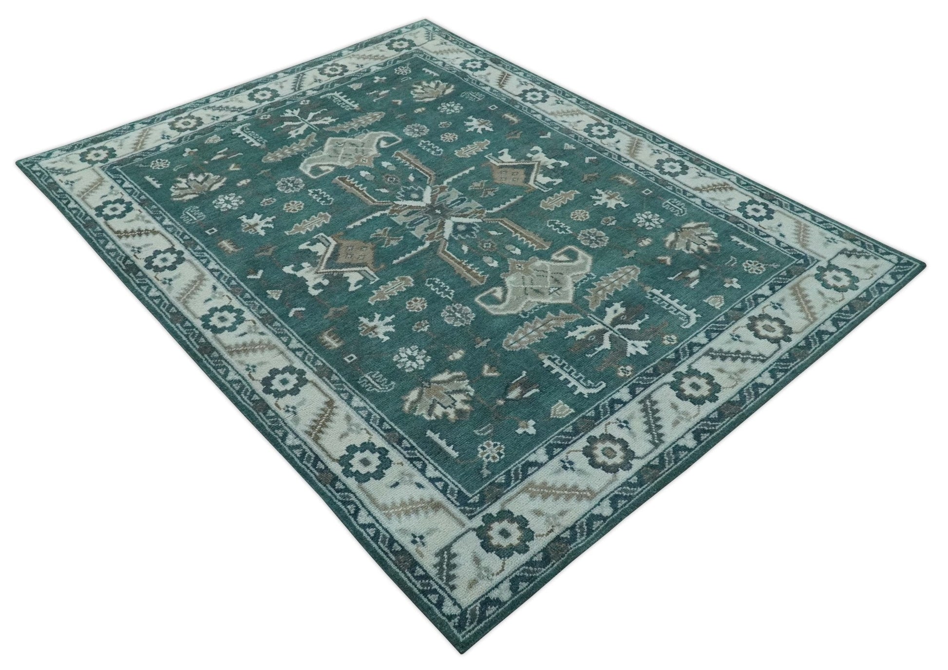 Custom Made Traditional Mamluk Design Teal, Ivory and Brown Hand Knotted wool Area Rug