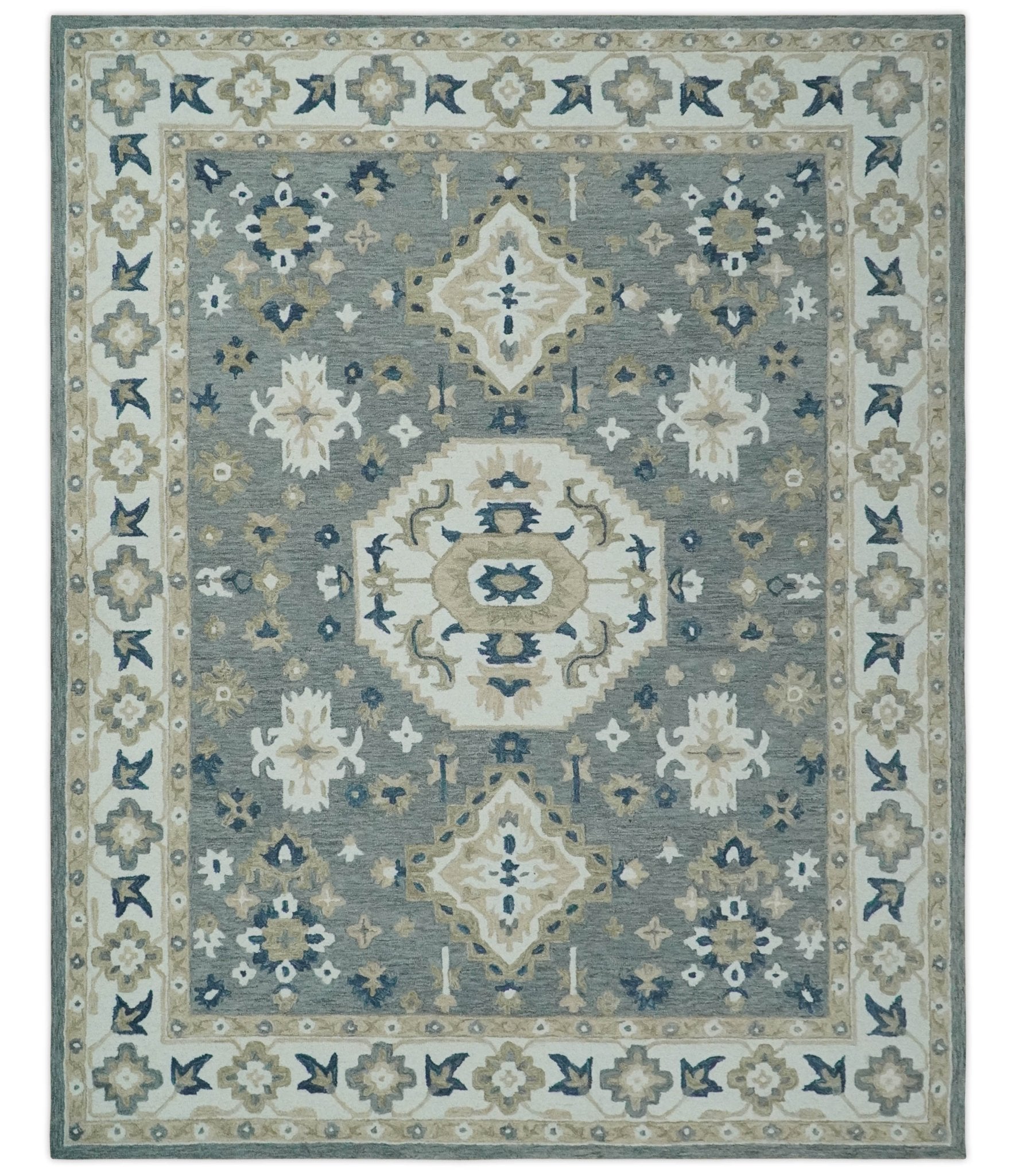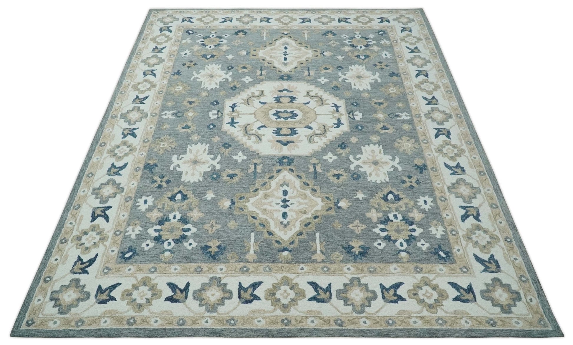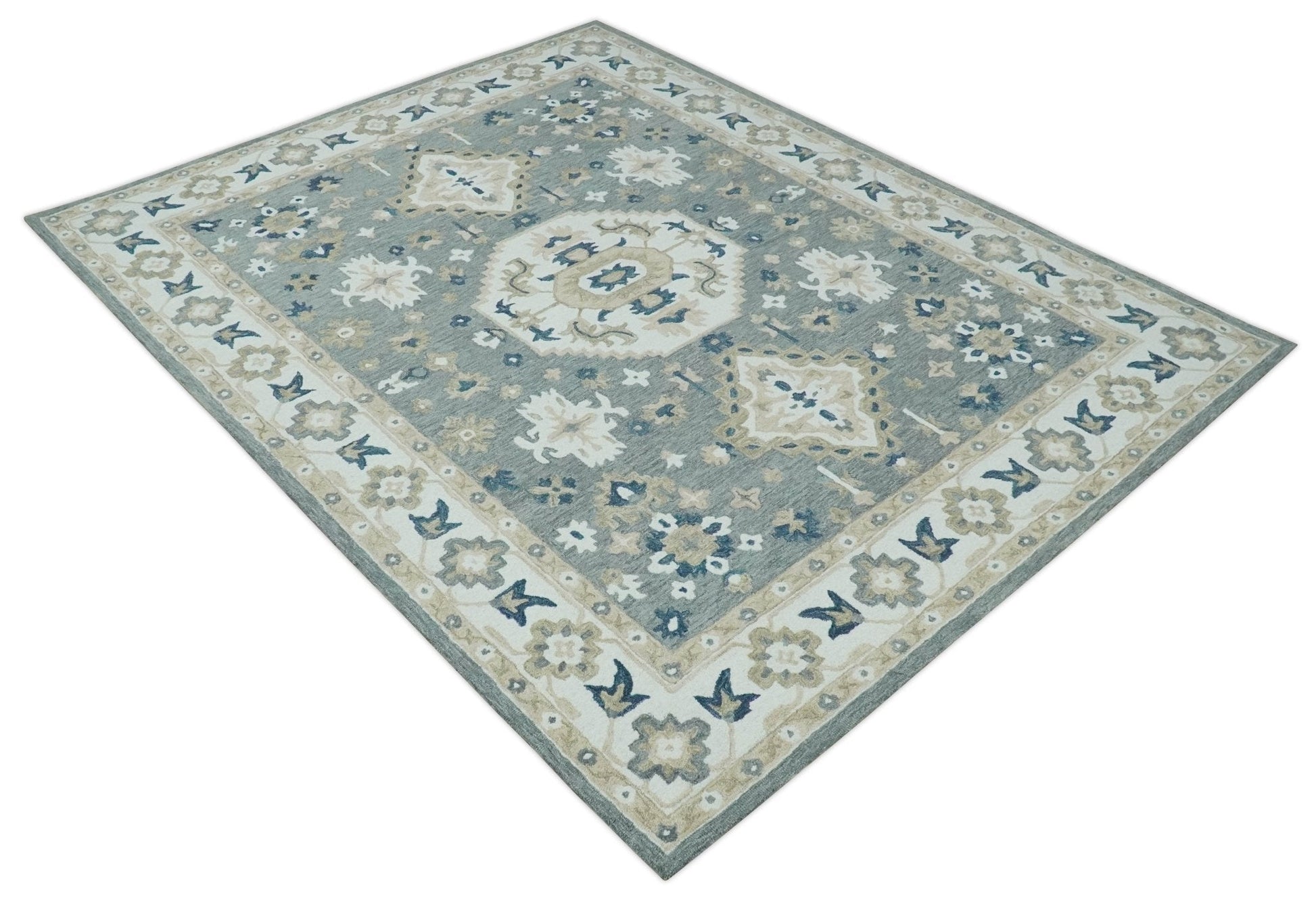 Custom Made Traditional Medallion Gray, Ivory, Beige and Blue Hand Tufted wool Area Rug