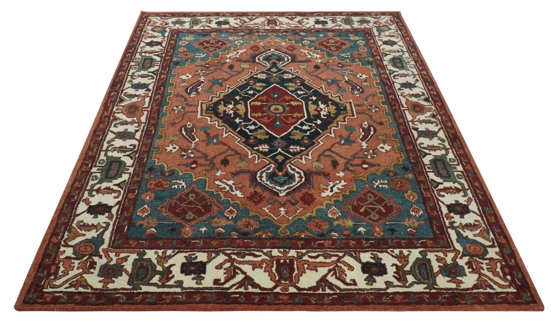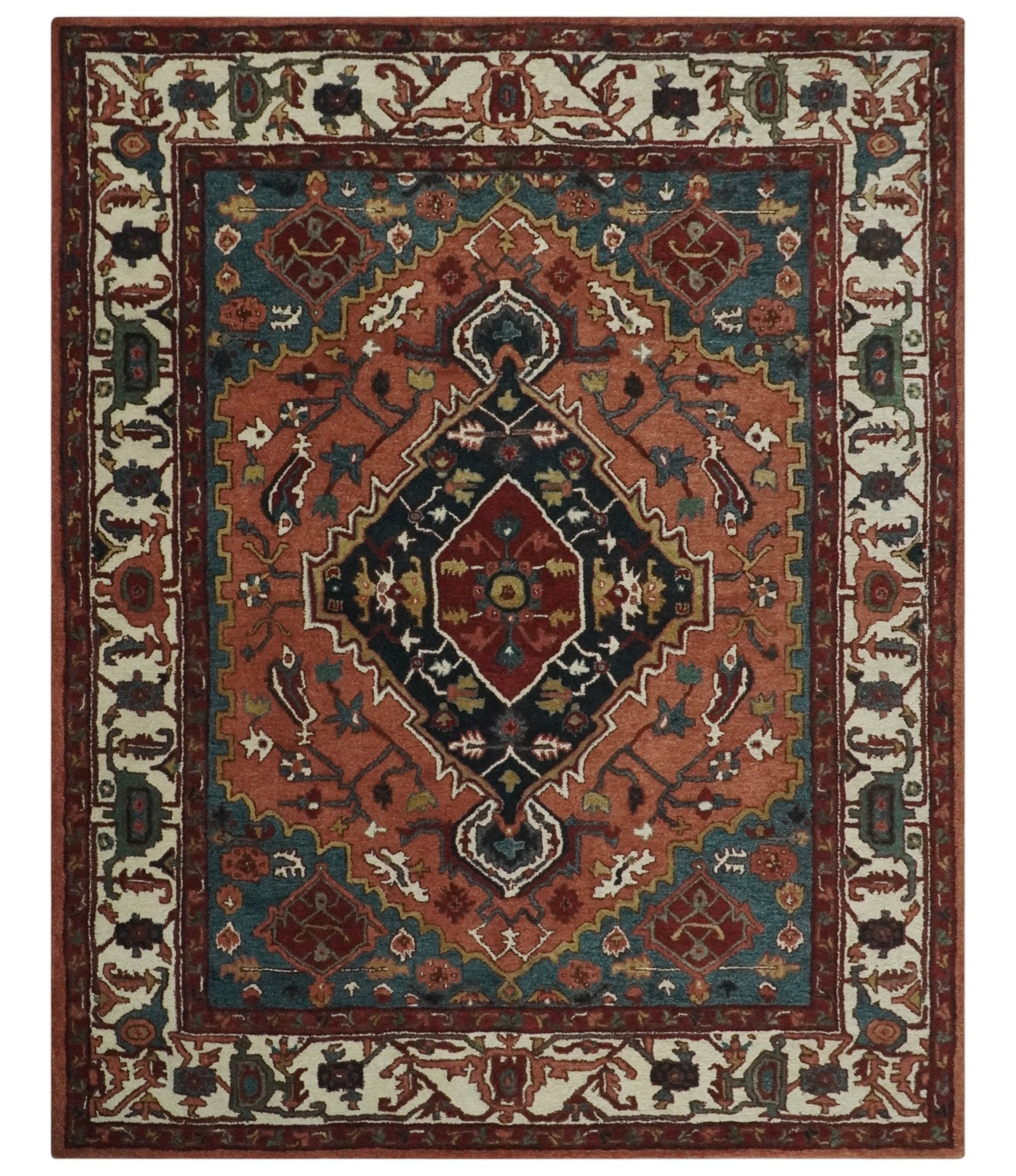 Custom Made Vintage Style Black, Rust, Teal and Ivory Hand Tufted Traditional wool Area Rug