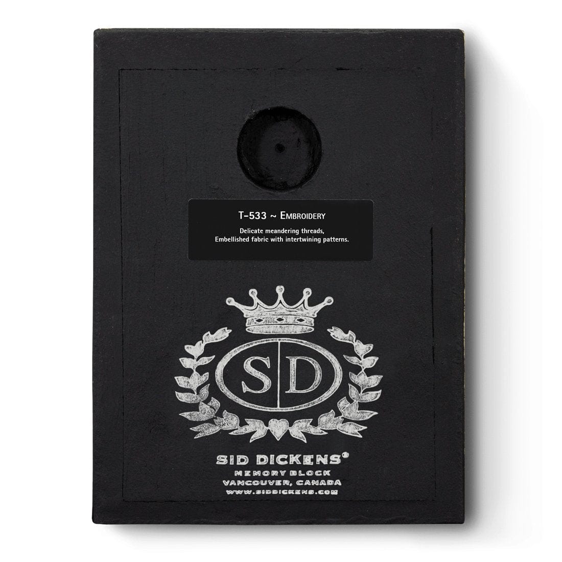 Delicate meandering threads, embellished fabric with intertwining patterns. This Sid Dickens Memory Block captures the essence of intricate embroidery, adding a touch of elegance to any space. Each piece is meticulously crafted, showcasing the timeless artistry that Sid Dickens is renowned for.