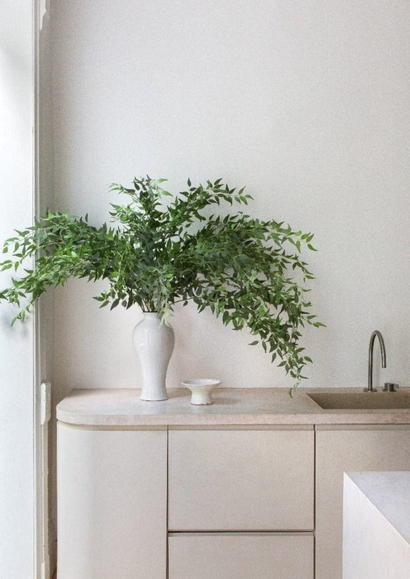 Enhance your home decor with nature-inspired fake greenery, like this tall, stunning silk Italian ruscus stem with grey green artificial leaves. Just style the leaf branches in a tall vase to create a simple but sophisticated look.