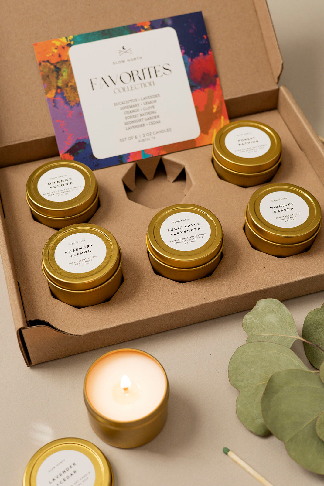 This box contains six 2oz mini-candles, each a crowd favorite in its unique way. Our mini candles are perfect for trying out new scents or for taking with you on the go.