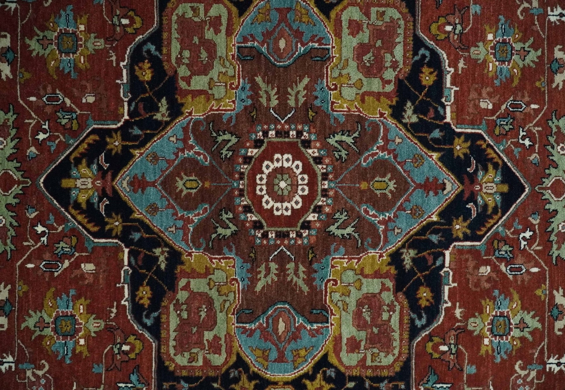 Hand Knotted Rust, Blue and Black Traditional Vintage Style Heriz Serapi Custom Made Wool Area Rug