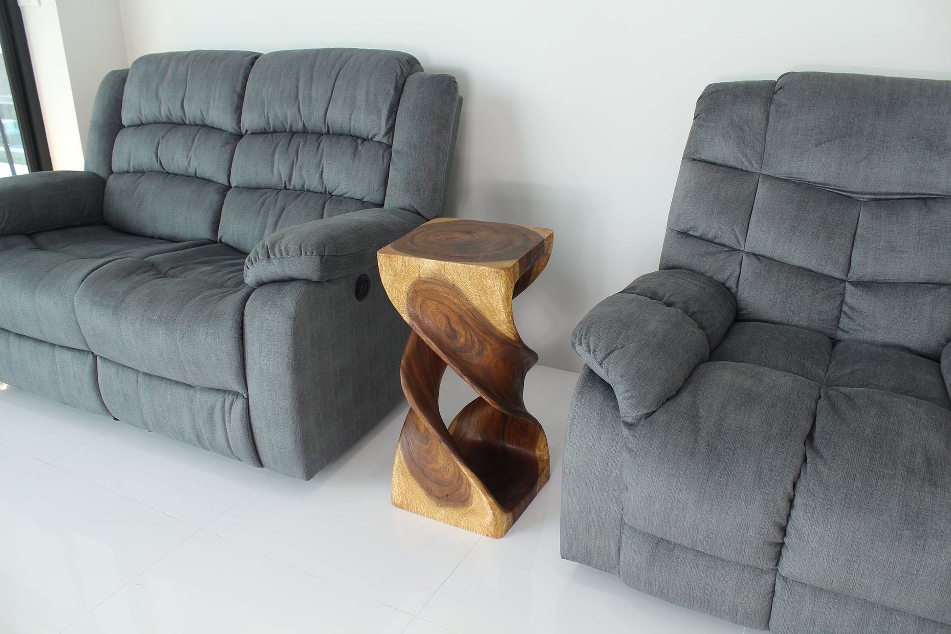 The 12 inch square by 26 inch high Double Twist stool is a visual delight in any setting. Use as a bar or kitchen counter stool, food safe finish that is water resistant. Its graceful one-quarter turns will add a sense of serenity and beauty to your home. This one-of-a-kind piece can be appreciated from any angle. Alternately use it as an end table, display stand or stool for last-minute extra seating. Two together can serve as a striking coffee table. At 12 inches square and 26 inches high