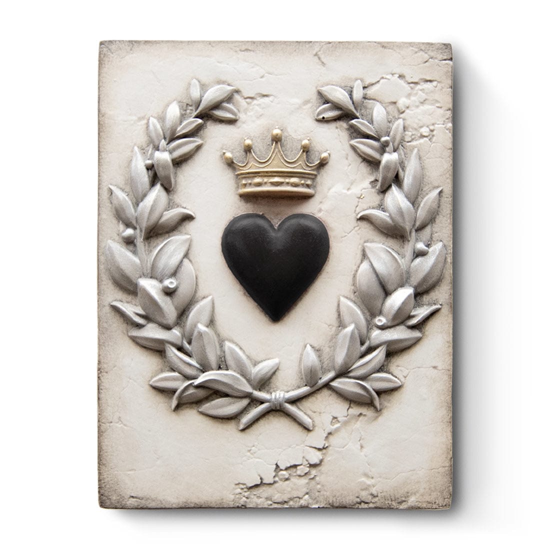 Introducing the exquisite Il Mio Re (Black) Memory Block by Sid Dickens. This beautifully crafted piece measures 6x8 inches and features a striking black heart crowned with a regal gold crown, surrounded by an elegant laurel wreath. Each Memory Block is handmade, ensuring that every piece is unique with slight variations that add to its charm.