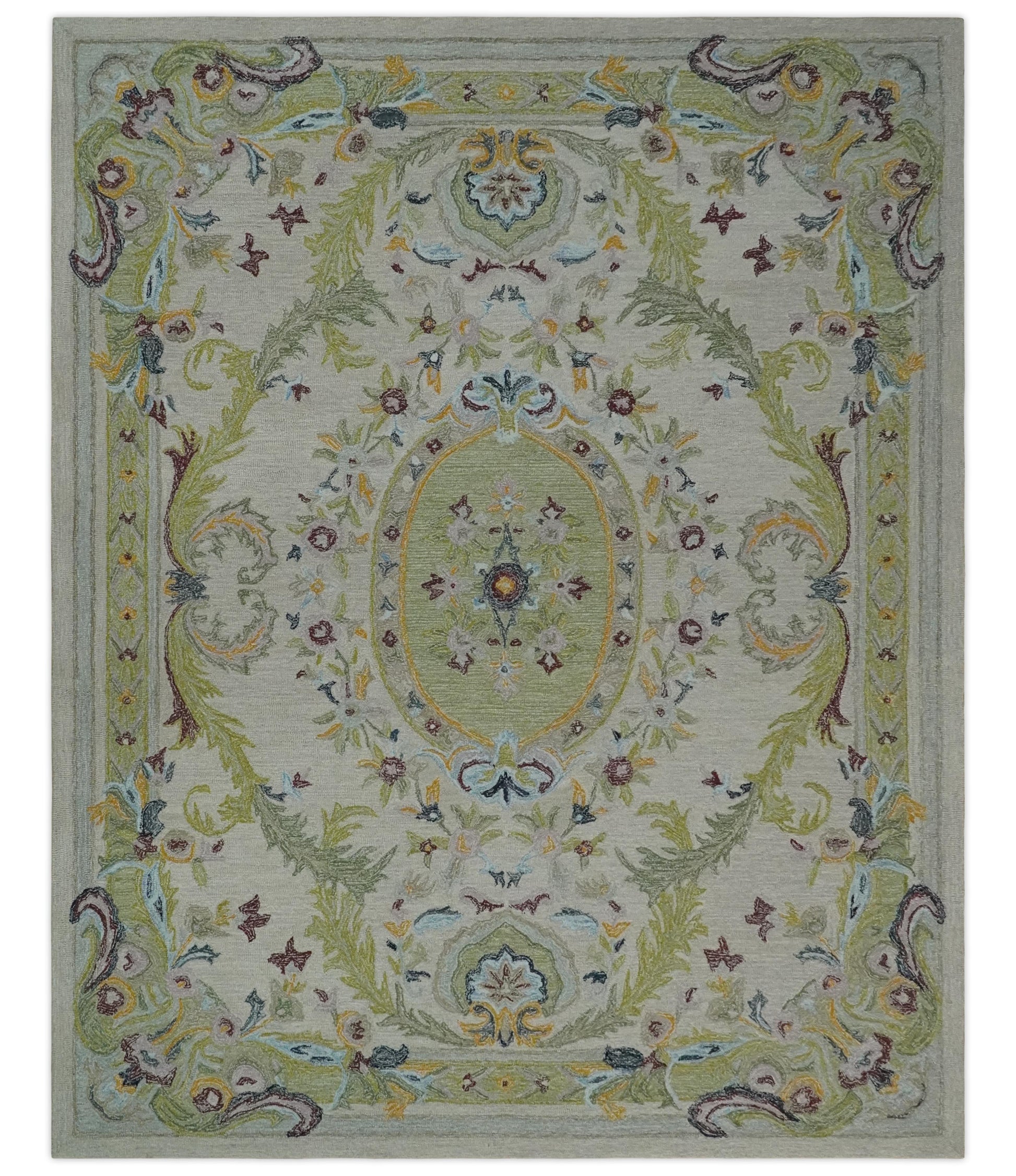 Ivory and Green Custom Made French Design Aubusson Hand Tufted Wool Area Rug