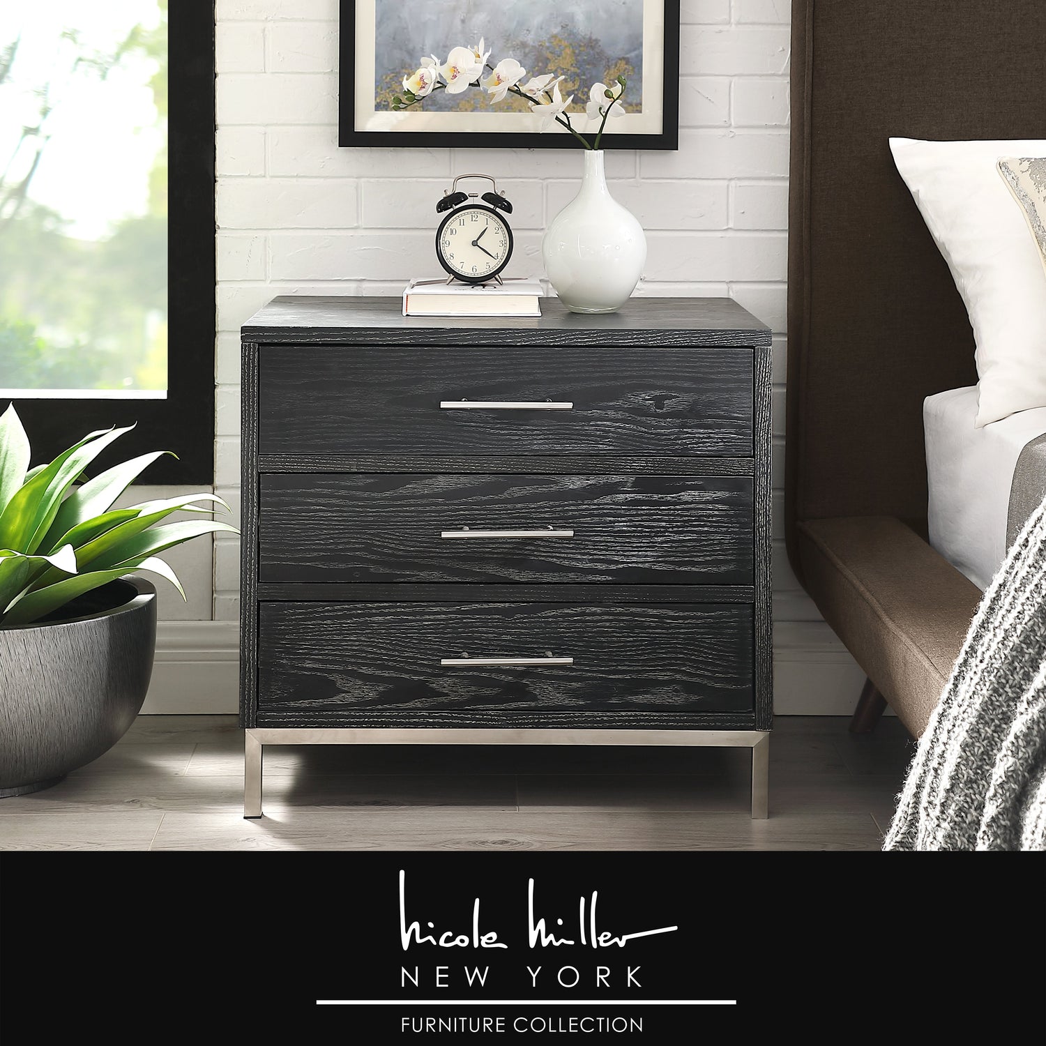 With a clean cut silhouette and simple metal brushed accents, this side table is a perfect addition to a stylish restful retreat. Three sliding drawers open to reveal plenty of room to tuck away small daily must-haves, while the top offers space to place a lamp, books, framed photos and glossy ceramic vases. This table features real wood veneers on all exterior surfaces. Sleek and sophisticated, this is the perfect piece to give your living space an uplifting atmosphere.