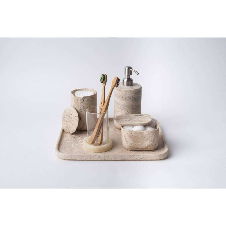 Introducing the exquisite Square Container by AndJacob, a perfect blend of functionality and elegance. Crafted from premium travertine, this container is designed to hold a variety of items such as bath hats, q-tips, bath salts, and soap pumps. Its versatile design makes it an ideal addition to your bathroom, dressing table, or any space that needs a touch of sophistication.
