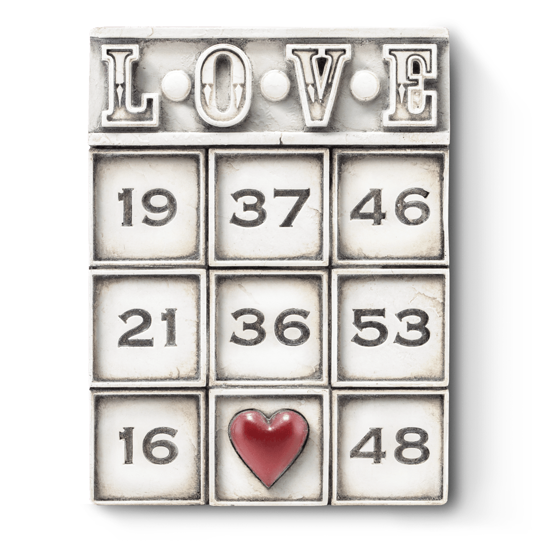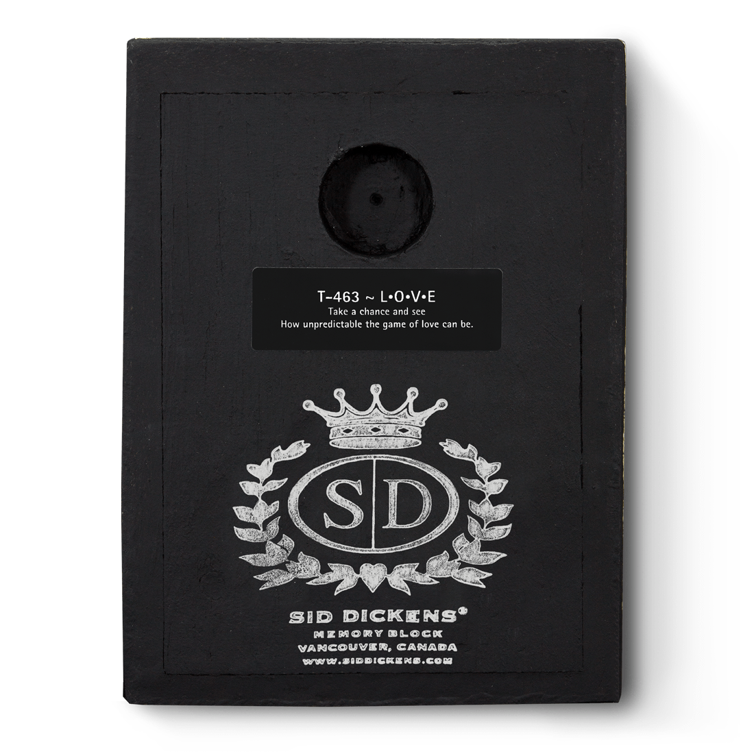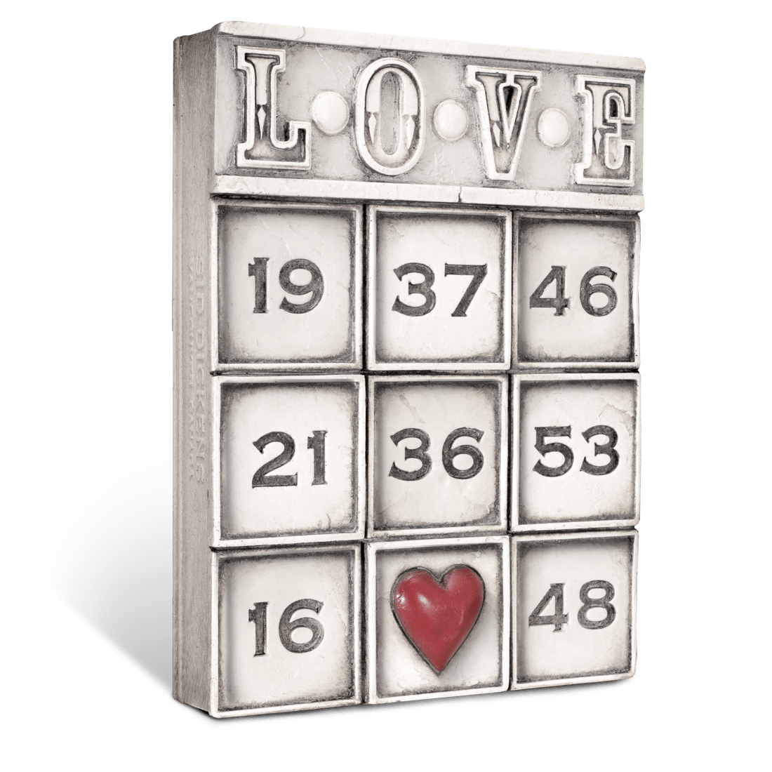 Take a chance and see how unpredictable the game of love can be with this beautiful, retired Memory Block by Sid Dickens. Featuring a charming design with a red heart and vintage-style numbers, this piece is perfect for Valentine's Day or any romantic occasion.