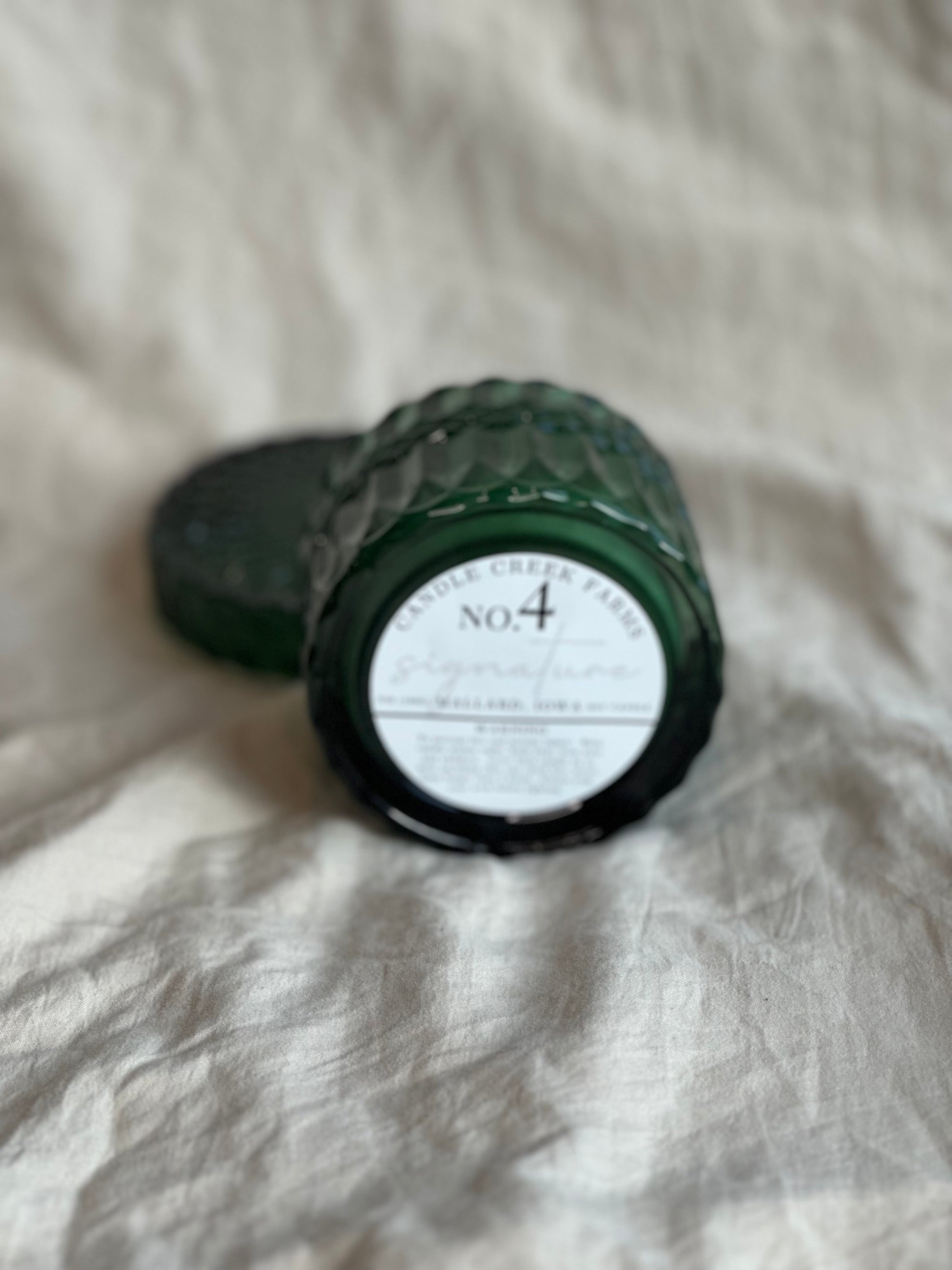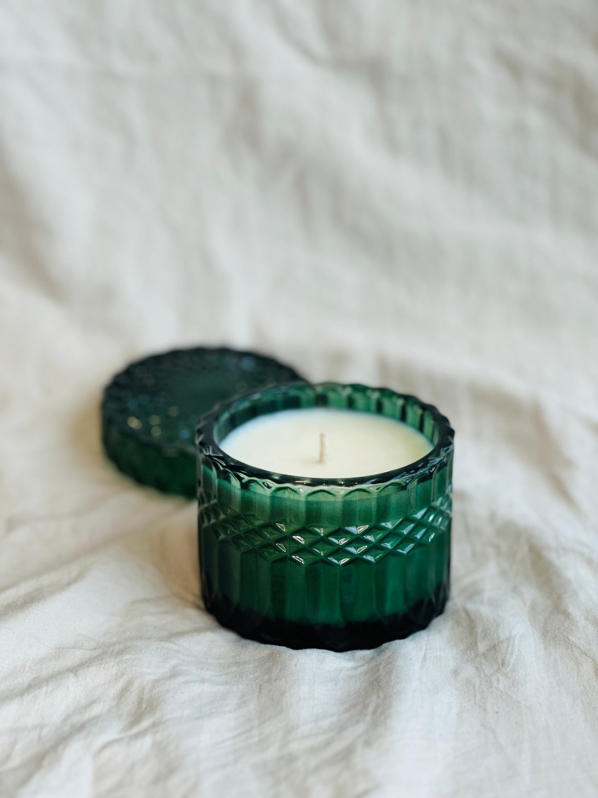 Smells like Midnight Amber. Seductive deep amber and gold woods combined with sugared jasmine. Hand poured in an emerald, vintage-inspired glass vessel.