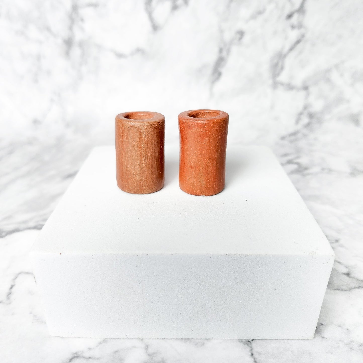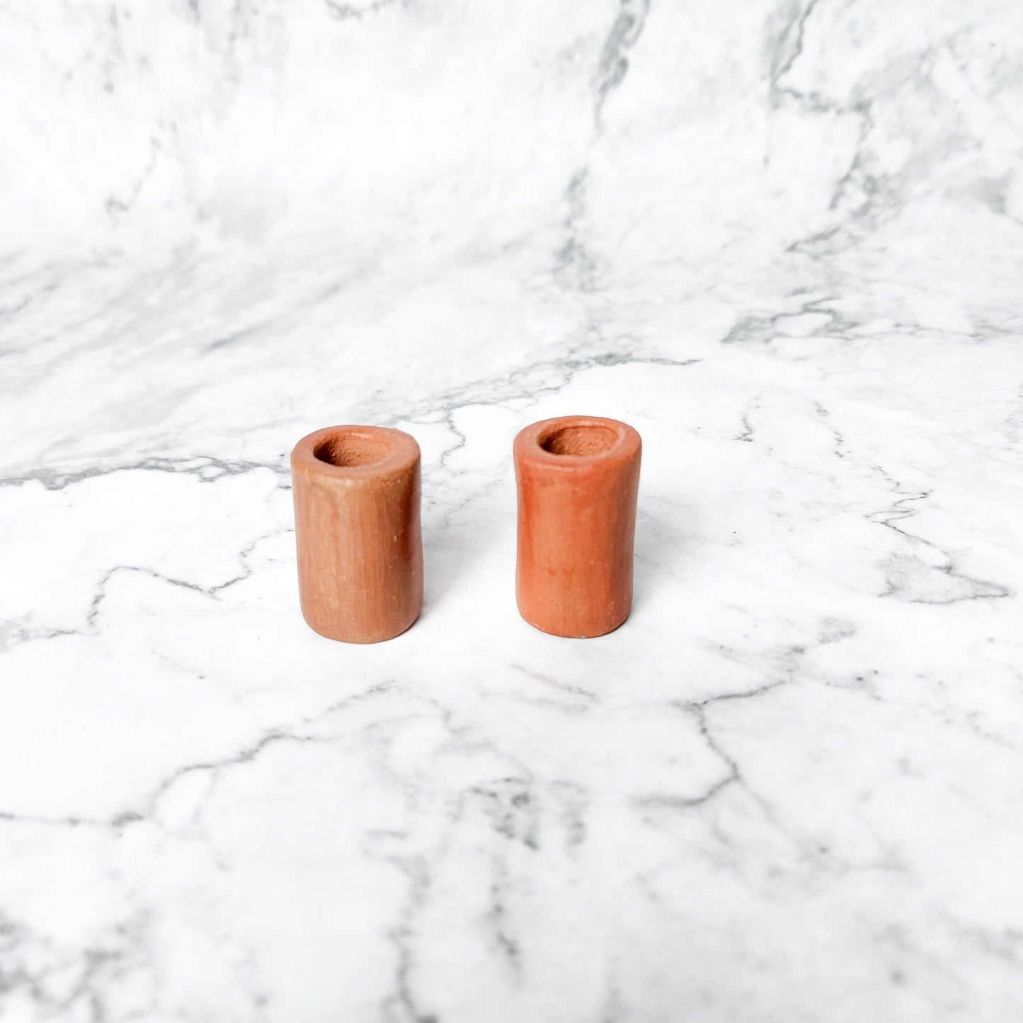 Discover the charm of our Simple Terracotta Candle Holders, available in a delightful set of two. These exquisite pieces are handcrafted by skilled artisans from Chenautla, ensuring each holder is unique and of the highest quality. Perfectly sized at 1'' x 1.5'', they feature a 1/2'' candle opening, making them ideal for our Myrtle Wax Candles or any similarly sized candle.