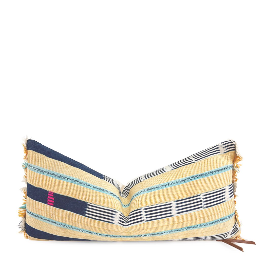 Bring a touch of vintage style and boho chic to your home with this Blue, Yellow, and White Striped Boho Chair Pillow. Made from 100% handwoven cotton, this pillow is soft and comfortable, featuring playful pops of color and a small fringe on each side. The combination of yellow with neon, blue, and white, along with dark blue and yellow, creates a masculine yet decorative throw pillow perfect for lower back support in your favorite chair.