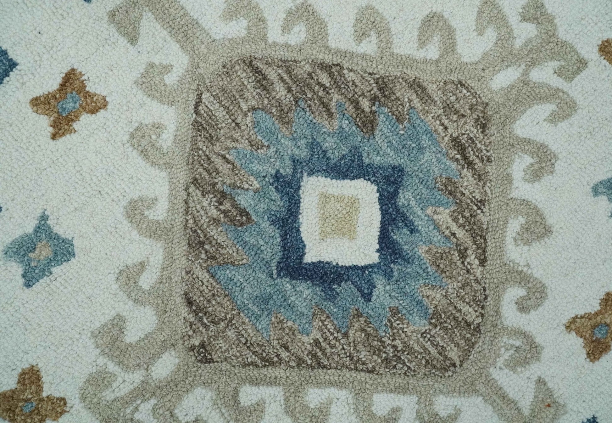 This Traditional, Large Design Hand Tufted Custom Made wool rug boasts a rich color palette of Ivory, Blue and Beige. Crafted with a durable wool material, this rug will add a warm and inviting atmosphere to any room for years to come.