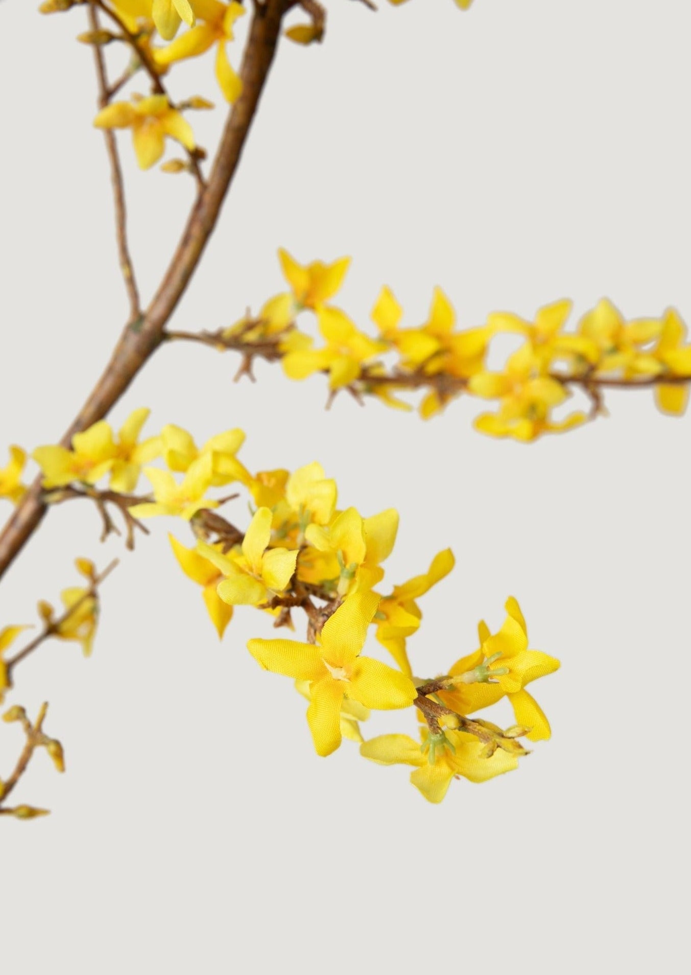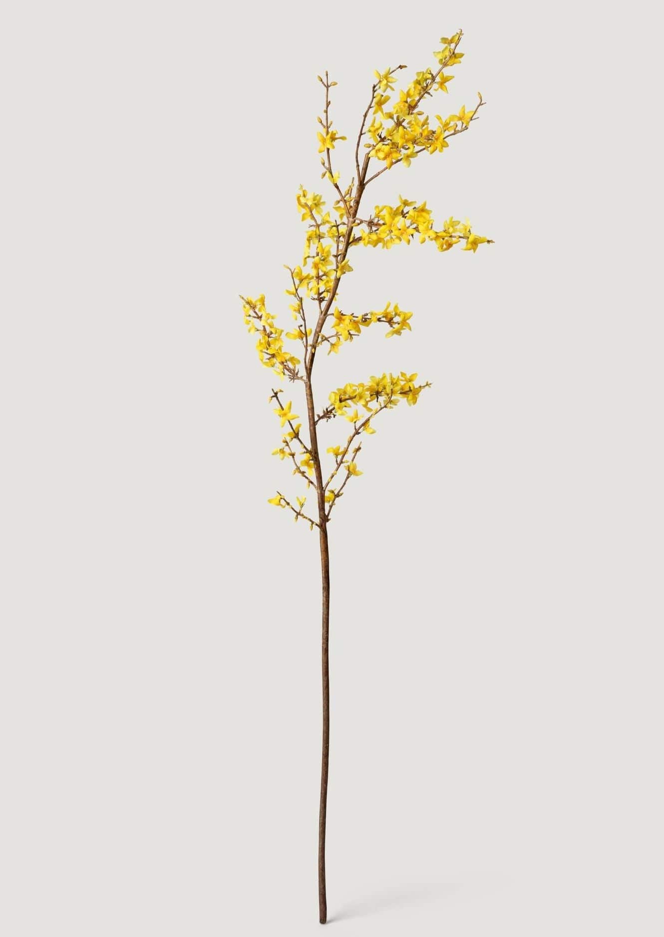 Create elevated table vase centerpieces for interior design styling and home decorating with artificial blooming branches, like this tall and stunning yellow silk forsythia branch with plastic budding accents. Always in bloom, these faux forsythia flowers let you enjoy a permanent feeling of spring in your space. Showcase several of these floral branches in a standalone vase arrangement, and you have an over-the-top statement look inspired by nature's beautiful botanicals.
